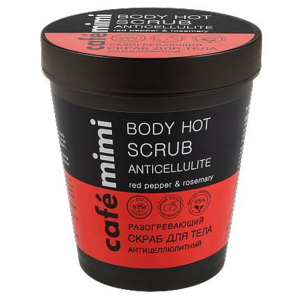 Скраб для тела с разогревающим эффектом содержит экстракт красного перца и эфирное масло розмарина - незаменимый помощник в борьбе с целлюлитом. Кожа выглядит заметно более гладкой и подтянутой за счёт эффективного действия натуральных активных ингредиентов. Экстракт красного перца обладает разогревающим свойством, оказывает лимфодренажное действие, стимулирует местное кровообращение, помогает избавиться от эффекта «апельсиновой корки» на проблемных участках тела. Эфирное масло розмарина – для повышения упругости и эластичности кожи. Сахар – для бережного, глубокого очищения и отшелушивания кожи без повреждений и раздражения.