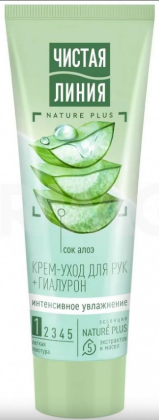 Встречайте крем для рук от Чистой Линии с усиленной формулой1 и в обновленном дизайне! Проблемы сухой и шероховатой кожи рук решит крем-уход Интенсивное увлажнение Сок алоэ от бренда Чистая Линия. В составе продукта 97% компонентов натурального происхождения*. Крем содержит эссенцию из пяти экстрактов и масел NATURE PLUS (экстракты вербены и пиона, масла миндаля, льна, оливы), сок алоэ и гиалурон. Благодаря эффективной формуле крема кожа получает увлажнение в течение 24 часов2. Активные натуральные компоненты глубоко3 увлажняют кожу рук, придавая ей мягкость и гладкость. - Экстракт вербены восстанавливает баланс увлажненности и тонизирует. - Экстракт пиона и льняное масло успокаивают и смягчают. - Масло миндаля содержит жирные кислоты, витамины Е и F, питает и выравнивает поверхность кожи. - Ферментированное оливковое масло богато природными антиоксидантами, питает и помогает пре