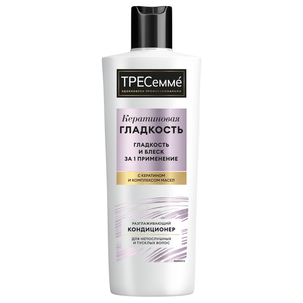 Кондиционер TRESemmé Keratin Smooth: формула с кератином и маслом марулы запечатывает волос в невидимый прозрачный слой, сглаживая любые неровности. 5 свойств, одна система укрощения волос: Разглаживает | Облегчает расчесывание | Придает блеск | Делает волосы послушными | Придает мягкость.