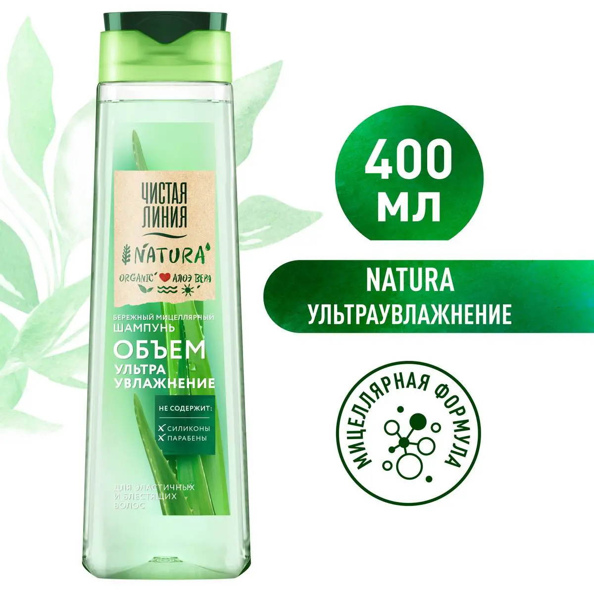 Чистая Линия NATURA – НАТУРА не содержит силиконов и парабенов. Мицеллярная формула шампуней бережно очищает кожу головы и волосы от загрязнений, а органические компоненты особо эффективны для восстановления, увлажнения и питания волос. Упаковка всех шампуней Чистая Линия NATURA – НАТУРА на 100% состоит из переработанного пластика, а формула полностью биоразлагаема. Шампунь содержит органический экстракт алоэ вера.
