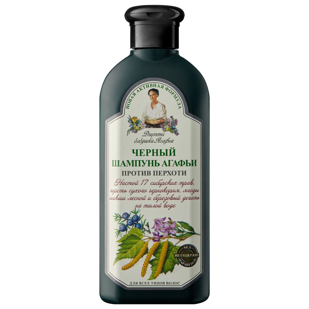 Черный шампунь Агафьи против перхоти создан на настое 17 сибирских трав и сухого чернокорня на талой воде с добавлением ягоды шикши лесной и березового дегтя. Березовый деготь славится своим чудным действием на кожу головы, предотвращая появление перхоти. Чернокорень улучшает кровообращение, а шикша питает волосы. Настой трав сибирских на талой воде успокоит кожу головы, избавит от перхоти и укрепит волосы.