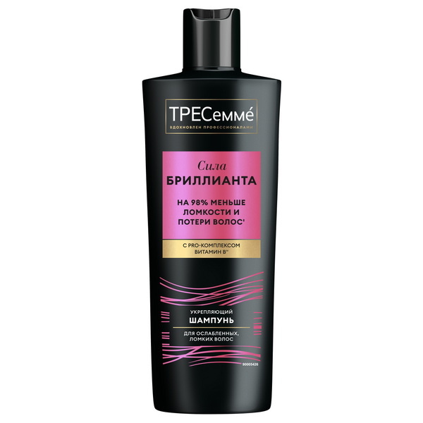 Как вернуть слабым ломким волосам силу и блеск? Система Diamond Strength с 18-MEA обрабатывает волокна волос по всей длине, борясь с причинами ломкости и выпадения. Результат: на 98% меньше ломкости и выпадения волос*. Скажи Пока слабым ломким волосам! Нанесите на влажные волосы, вспеньте, смойте. При попадании в глаза тщательно промойте попадание воды. Три шага к безупречному образу: 1. Шампунь для очищения 2. Кондиционер для питания 3. Стайлинг для фиксации TRESemmé® – выбор профессиональных стилистов недель моды в Нью-Йорке и миллионов женщин по всему миру. Профессионалы Недели моды в Нью-Йорке знают: мастерство укладки зависит от качества волос. Поэтому они выбрали TRESemmé® – профессиональную основу для создания любого образа. За брендом TRESemmé, который появился в салоне красоты, стоит простая истина: стильная женщина должна выглядеть и вести себя великолепно, и все благодаря при