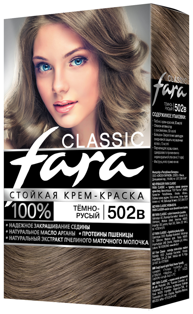 Стойкая крем-краска для волос Fara Classic 502в Темно-русый. Мягко окрашивает, придавая волосам стойкий насыщенный цвет. Натуральные оттенки всегда популярны. Очень важно при выборе краски темно-русого тона учитывать цвет глаз. Fara Classic 502в как нельзя лучше сочетается с серо-зелёными, серо-голубыми, серыми и голубыми глазами. Подобное сочетание дополнит образ и внесёт неповторимую изюминку в Ваш образ!