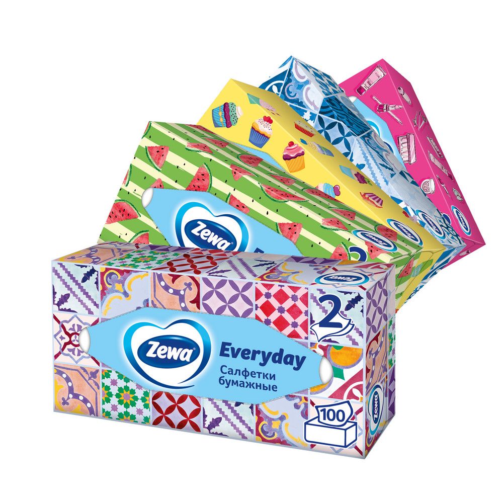 ZEWA 100шт Салфетки косметические Everyday 2-х слойные, в картонном боксе, белые