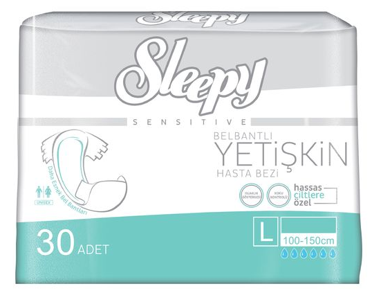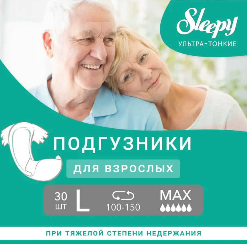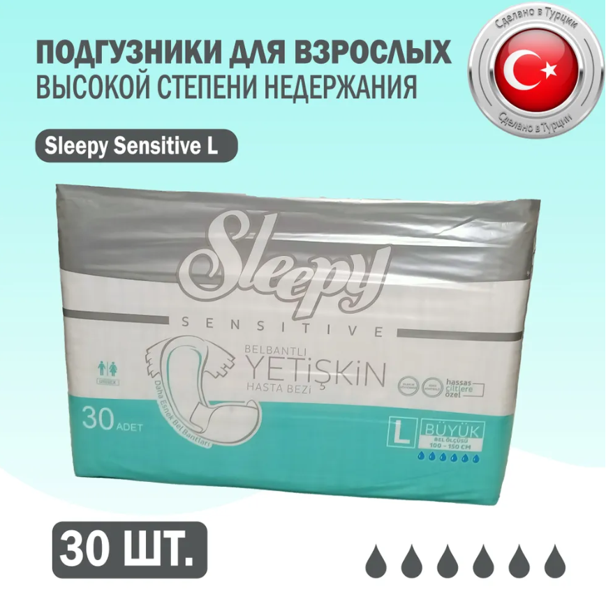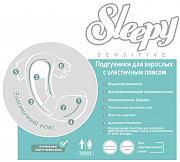 Подгузники SLEEPY SENSITIVE L (талия 100-150см) 30 шт.Подгузники для взрослых SLEEPY SENSITIVE рекомендуются для использования при тяжелой стадии недержания мочи.