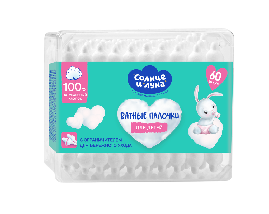 СОЛНЦЕ И ЛУНА 60шт Ватные палочки для детей с ограничителем