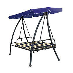 Трехместные садовые качели. Тент защищает от осадков и солнца. Мягкий матрасик добавляет комфорта в использовании. Механизм наклона: звеньями цепи на требуемый угол наклона, с фиксацией в горизонтальном положении.