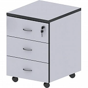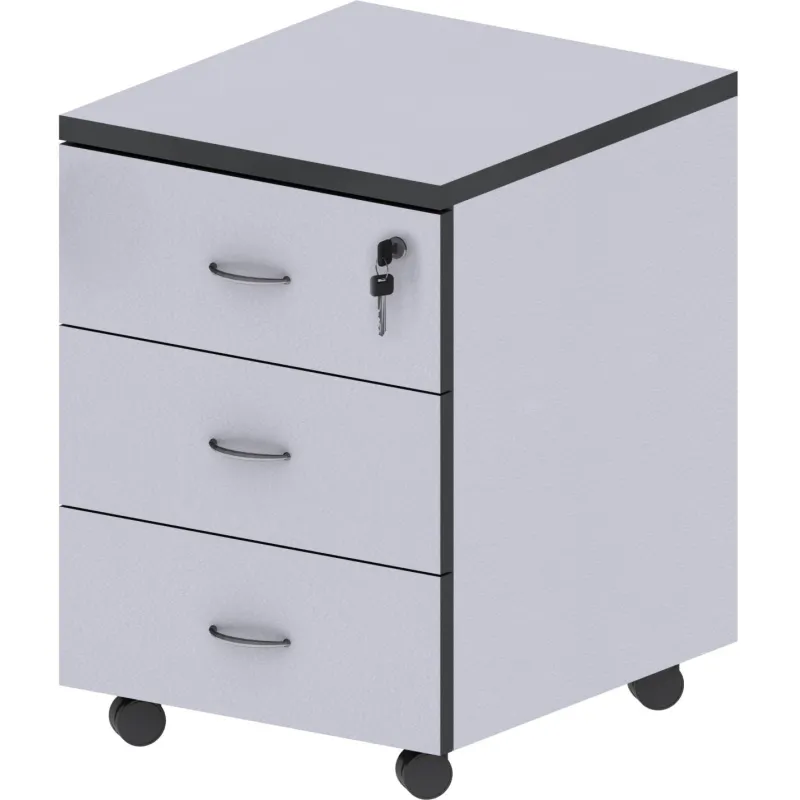 Тумба Агат на колесных опорах. Корпус серого цвета выполнен из ламинированной древесно-стружечной плиты, безопасной для здоровья и окружающей среды. Торцы топа и прочие видимые кромки защищены от повреждений ударопрочной и термоустойчивой пленкой ПВХ. Тумба снабжена замком и тремя выдвижными ящиками. Материал и толщина топа и кромки: ЛДСП 22 мм, ПВХ 2 мм. Материал и толщина каркаса и кромки: ЛДСП 18 мм, ПВХ 0,5 мм. Материал и толщина задней стенки: ЛДСП 18 мм.
