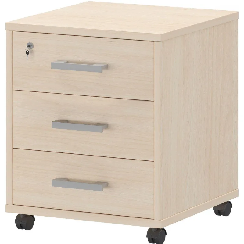Выкатная тумба Арго имеет размеры 58×44 см и глубину 45 см. Изготовлена из деревоплиты (ДСП) с износостойким ламинированным покрытием цвета бук. Оснащена тремя выдвижными ящиками, верхний из которых закрывается на ключ. Кромки отделаны лентой из ПВХ для защиты от повреждений. Основание тумбы с четырьмя роликами для удобного перемещения. Боковая и задняя стенка выдвижного ящика выполнена в цвете лайм.