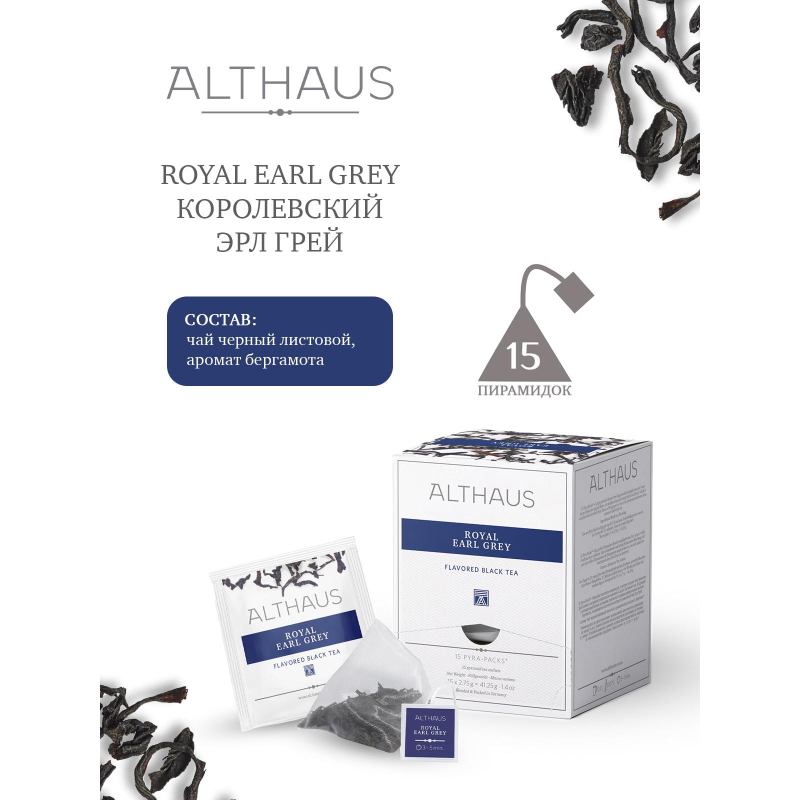 Чай Althaus Pira Pack Roayal Earl Grey черный байховый с бергамотом 15 пакетиков представляет собой насыщенную и яркую смесь лучших черных листовых чаев из Индии, Цейлона и Китая с впечатляющим вкусом и освежающими нотками бергамота. Althaus Royal Earl Grey доставит вам истинное удовольствие в моменты утреннего пробуждения, восполнит энергию в обеденный перерыв и успокоит в вечерние часы. Это напиток, созданный для теплых и запоминающихся мгновений, для ярких встреч и важных разговоров. Он займет достойное место в домашней чайной коллекции, а также в офисе, ресторане, гостинице и многих других местах, где чашка горячего чая никогда не будет лишней. В упаковке содержится 15 больших пакетиков-пирамидок, которые позволяют полностью раскрыться чайным листьям, отдавая максимум вкуса и аромата для получения насыщенного напитка. Каждая пирамидка дополнительно убрана в четырехслойный конверт, который состоит из белой бумаги с названием и фирменным логотипом, полиэтилена пониженной плотности, алюминиевой фольги и полипропилена, что исключает потерю первоначального вкуса и аромата чая в процессе транспортировки и хранения. Приятного чаепития! Способ приготовления: заварить чайную пирамидку кипяченой водой 95-100 градусов и настоять его 3-5 минут. Состав: чай черный байховый мелкий, ароматизатор пищевой бергамот. Количество пакетиков в упаковке: 15 штук. Тип упаковки: картонная. Хранить в сухом, прохладном месте отдельно от сильнопахнущих продуктов. Страна производства: Германия.