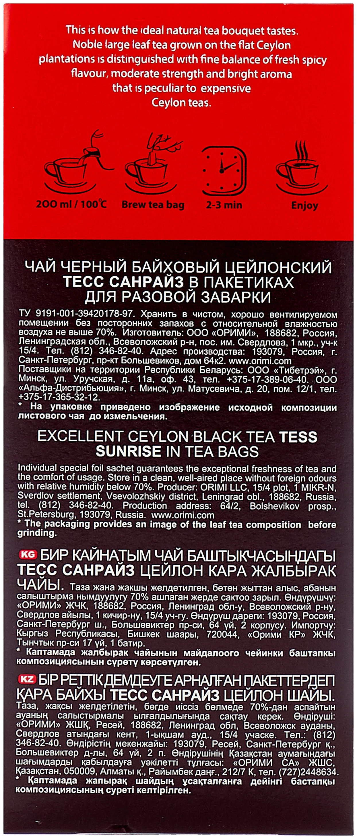 Великолепный пример совершенства природного чайного букета. Чай Tess Sunrise создан, чтобы приветствовать начало нового дня! Так же как солнце наполняет день праздничным сиянием, так Tess Sunrise до краев наполняет вашу чашку ярким вкусом и торжественным ароматом великолепного цейлонского чая.