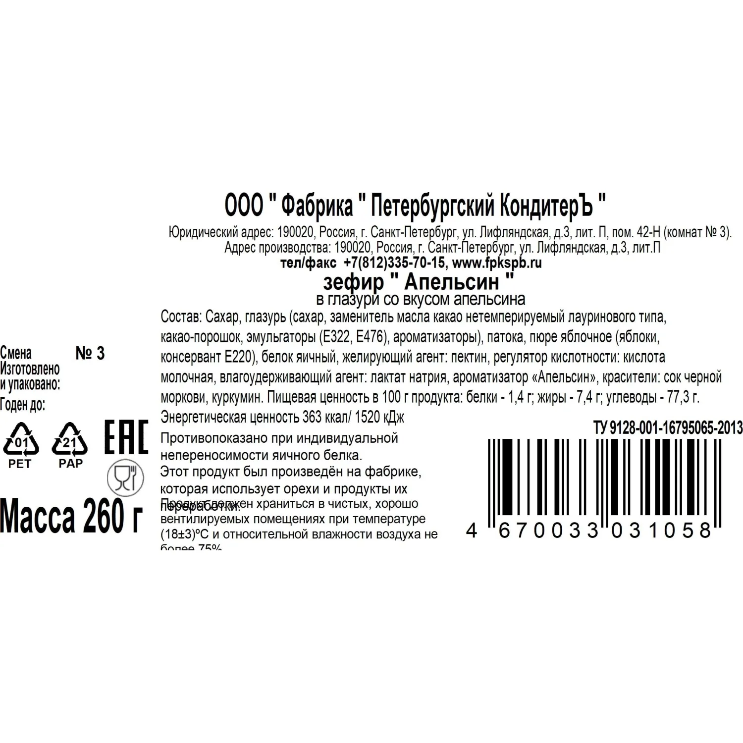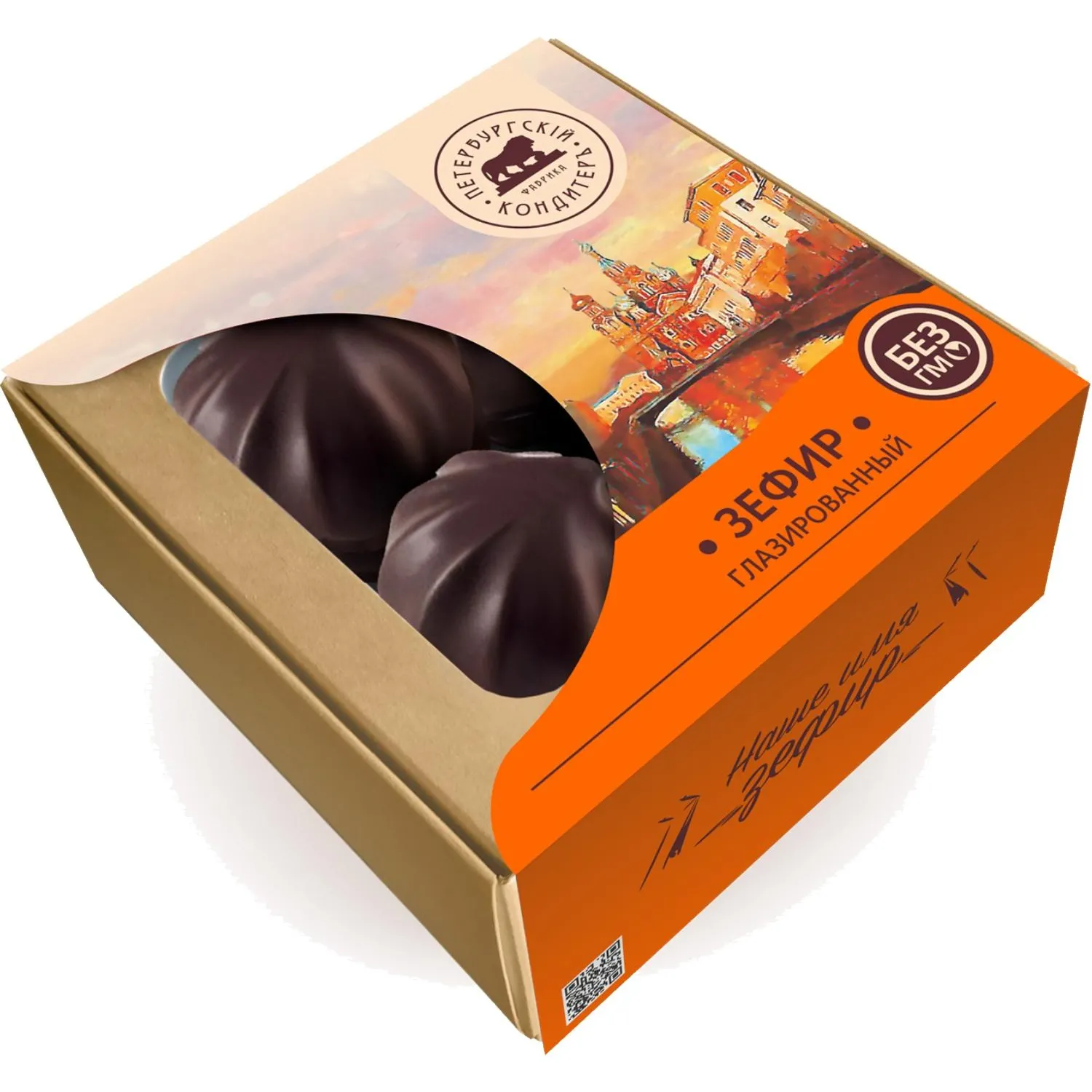 Зефир Петербургский КондитерЪ в глазури со вкусом апельсина.Состав: сахар, глазурь (сахар, заменитель масла какао нетемперируемый лауринового типа, какао-порошок, эмульгаторы (E322, E476), ароматизаторы), патока, пюре яблочное (яблоки, консервант E220), белок яичный, желирующий агент: пектин, регулятор кислотности: кислота молочная, влагоудерживающий агент: лактат натрия, ароматизатор «Апельсин», красители: сок чёрной моркови, куркумин.
