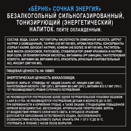 Очищенная газированная вода, регуляторы кислотности лимонная кислота, цитрат натрия 3-замещенный, таурин, ароматизаторы, консерванты сорбат калия, бензоат натрия, кофеин, растительные масла кокосовое, рапсовое, стабилизатор эфир крахмала и натриевой соли октилянтарной кислоты, витамины РР ниацин, пантотеновая кислота, витамин В6, витамин В12, краситель красный очаровательный ас, инозит.