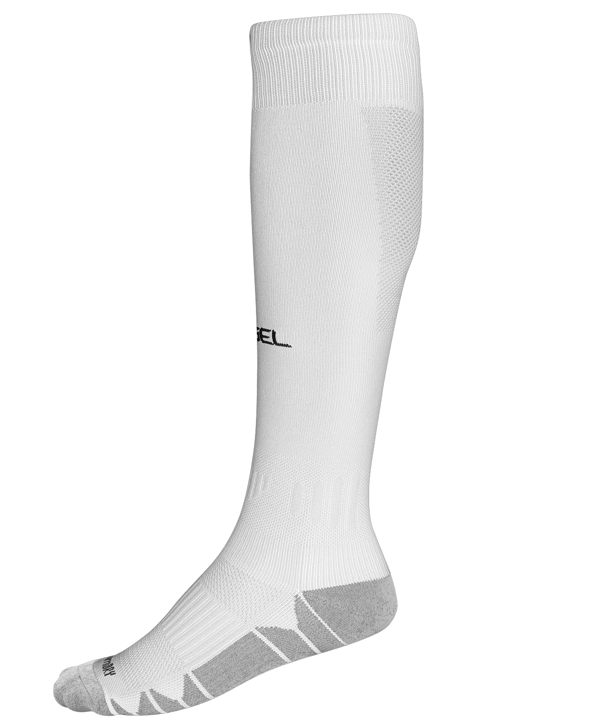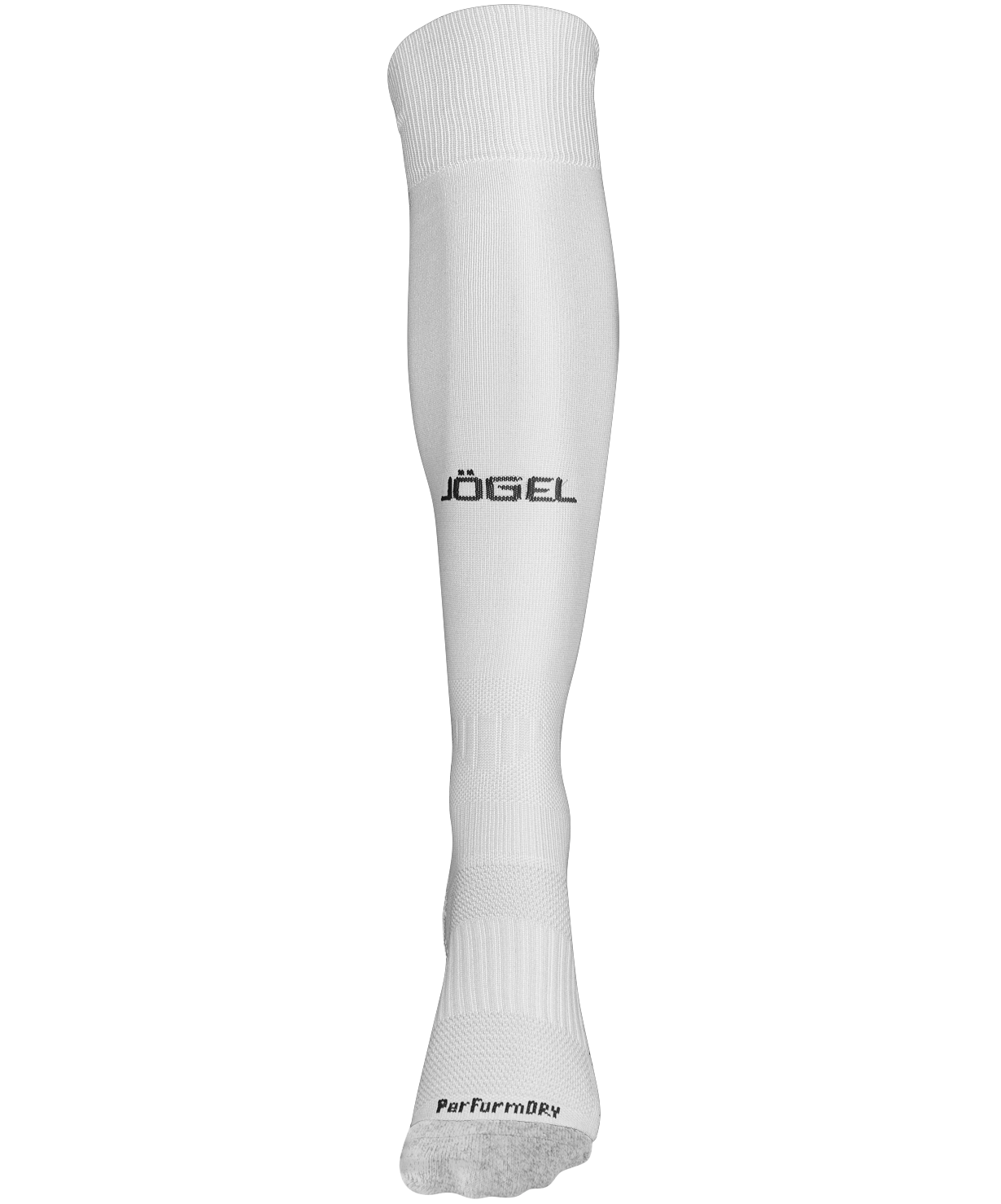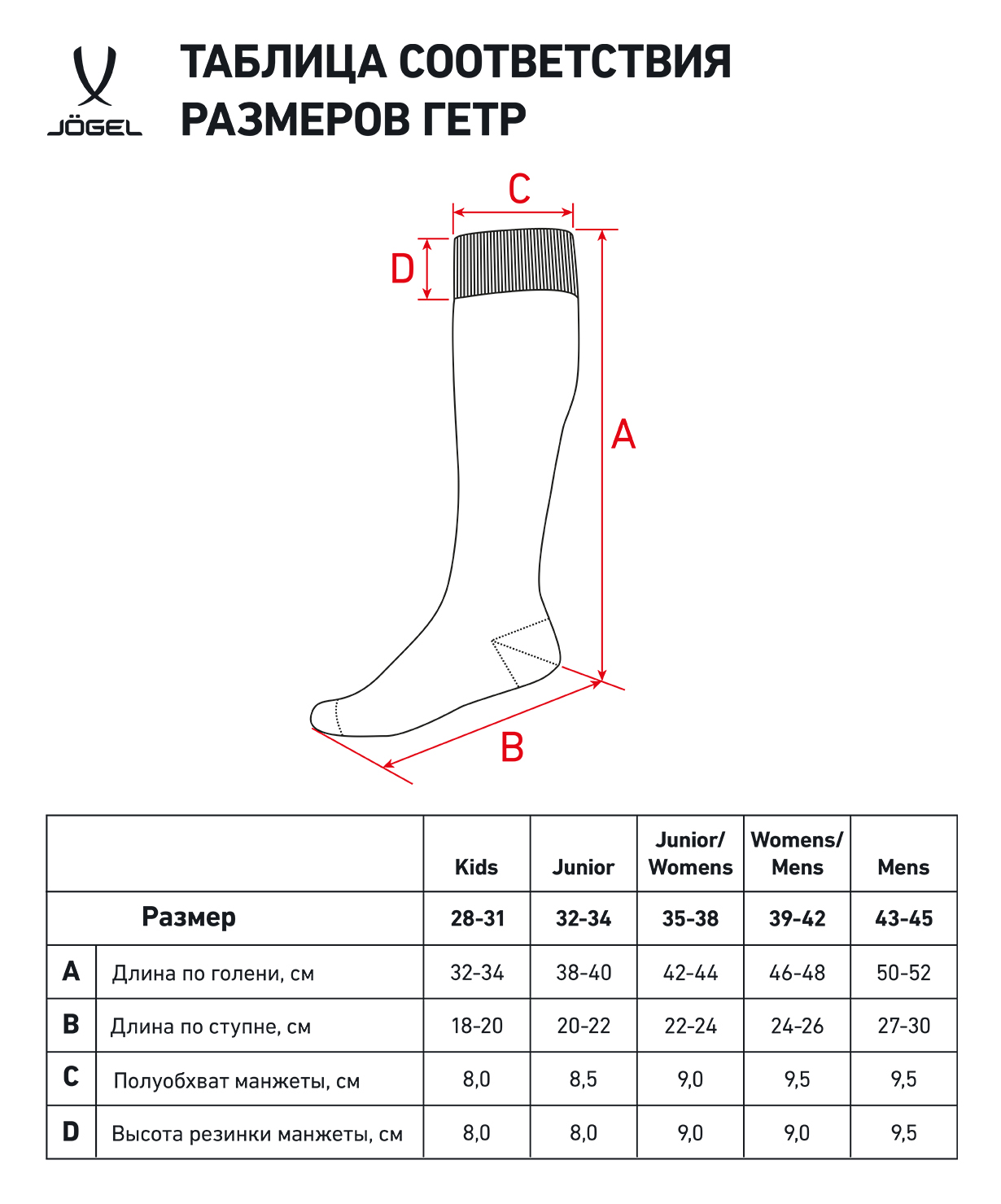 Двубортная высокая резинка удерживает спортивные гетры от сползания и позволяет носить их выше колен. На фронтальной части гетр расположен логотип бренда Jögel.