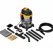 Пылесос строительный Denzel SVC15 28201 мощностью 1200 Вт, с баком объемом 15 л и шлангом длиной 2 м, предназначен для уборки бетонной, кирпичной пыли, опилок, стружки, также предусмотрена функция сбора воды. Пылесос используется во время проведения строительных и ремонтных работ, будет полезен для поддержания чистоты в мастерской, гараже, производственном помещении. Преимущества Термозащита - в случае перегрева двигатель автоматически отключается, что предотвращает его поломку. Влагозащита - внутренние компоненты надежно изолированы от попадания пыли и брызг воды по стандарту IP44. Функция выдува - пылесос можно использовать для очистки от мусора дорожек, ступеней, труднодоступных мест, а также для продувки деталей от пыли. Удобная уборка в узком пространстве - в комплект поставки входит щелевая насадка, облегчающая удаление пыли из ящиков, шкафов, отопительных радиаторов и т. д. Автоматический контроль уровня жидкости при сборе воды - как только количество воды в баке достигает предельно допустимого уровня, срабатывает предохранительный клапан и всасывание прекращается.