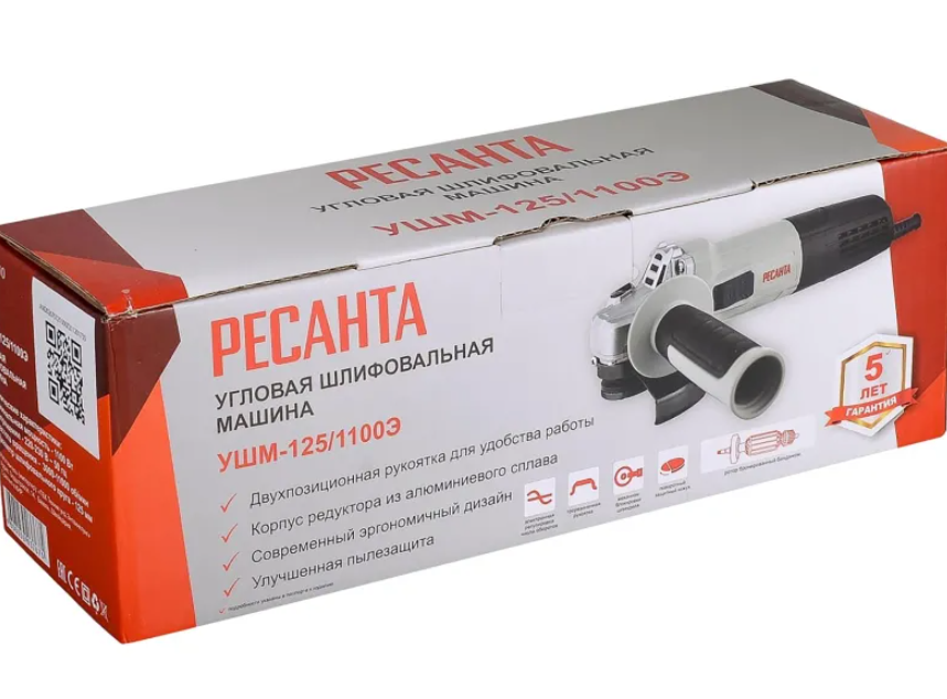 Особое внимание производитель этой модели УШМ уделил удобству и безопасности пользования. Шлифмашина имеет удобную компактную рукоятку, выключатель с защитой от несанкционированного включения и блокировку шпинделя, которая позволяет быстро и просто заменять оснастку. Защитный кожух шлифовальной машины можно зафиксировать в нескольких положения, поэтому безопасность оператора будет обеспечена при работе под разными углами. Длина кабеля питания Ресанта УШМ-125/1100Э составляет 2 м., чего в большинстве случаев хватает для проведения работ без использования удлинителя. Параметры электросети — 220 В, 50 Гц. В. Вес угловой шлифовальной машины — 2.2 кг.