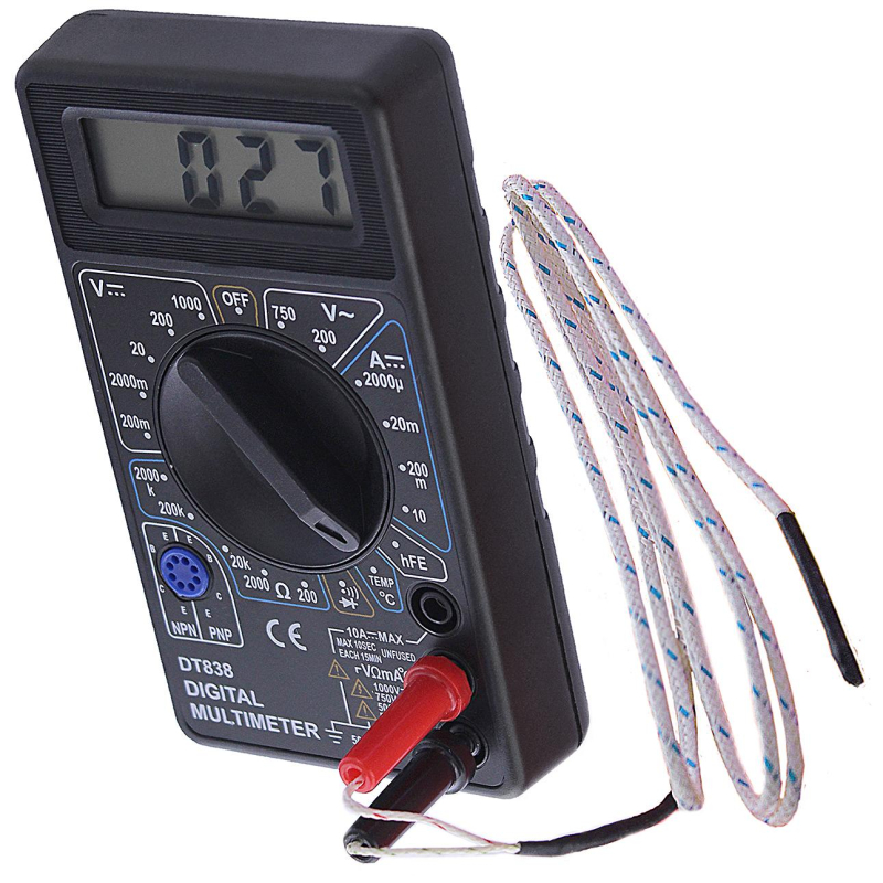 МультиметрDT-838 — это многофункциональный цифровой измерительный прибор, который найдет широкое применение благодаря богатым функциональным возможностям при небольших габаритах и весе. Мультиметр оснащен большим высококонтрастным дисплеем и удобным переключателем режимов. Автоматическое определение полярности тока дополнительно упростят выполнение измерений. Система контроля состояния батареи своевременно сообщит о необходимости ее замены, что минимизирует погрешности. Наличие предохранителя позволит снизить риск выхода из строя при перегрузке и неправильных действиях пользователя. Функция измерения температуры и коэффициента передачи транзисторов значительно расширит спектр применений. Мультиметр станет Вашим незаменимым помощником в домашней мастерской, лаборатории и производстве.
