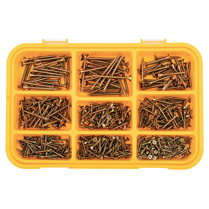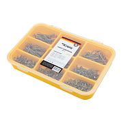 Большой набор состоит из 510 саморезов для ДСП и подойдет для объемных и длительных проектов. Поставляется в пластиковом органайзере, который помогает не только удобно хранить изделия, но и быстро находить крепеж нужного размера. Органайзер может в дальнейшем использоваться для хранения других крепежных элементов.