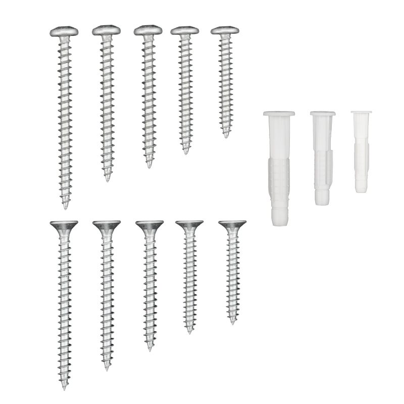 Саморезы изготовлены из стали, покрытой цинком, что обеспечивает изделиям высокую прочность и долговечность. В наборе два вида саморезов: с полукруглой головкой для надежного крепления тонколистовых материалов и с потайной головкой – используются там, где крепеж не должен выступать над поверхностью материала. Специальные зубцы и блокировочные язычки дюбелей обеспечивают максимальную силу трения в основании, препятствуя проворачиванию и вырыванию крепежа.