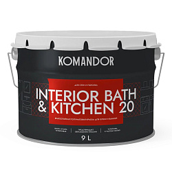 Краска интерьерная влагостойкая Komandor Interior Bath&Kitchen 20, полуматовая, база А, белая, 9 л