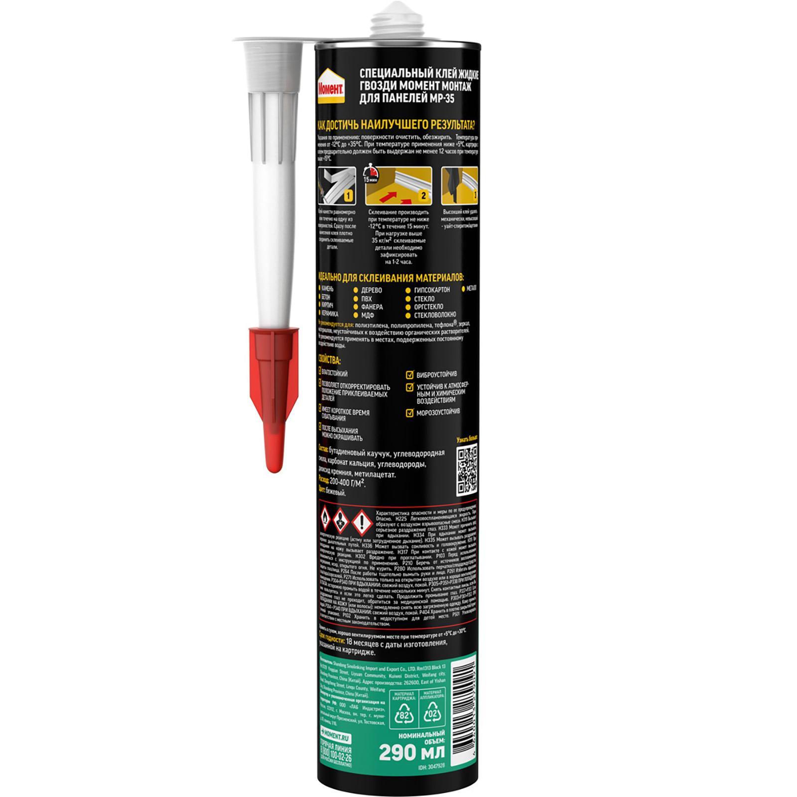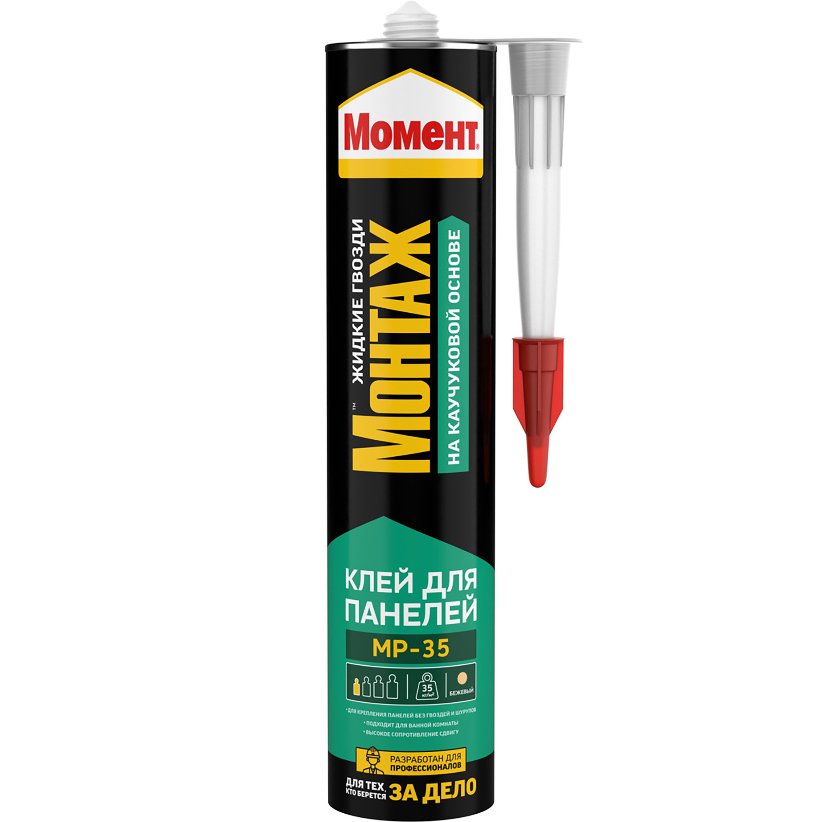 Клей каучуковый для панелей Момент Монтаж МР-35 идеально подходит для крепления изделий из стекла, камня, древесины, оргстекла, ПВХ, МДФ, гипсокартона, фанеры, стекловолокна, металла, керамики и др. Подходит для приклеивания на поверхности из бетона, камня, кирпича, дерева, гипсокартона, керамики и др.