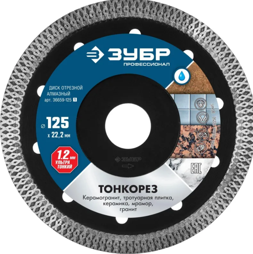 Диск алмазный ЗУБР Тонкорез сплошной d125х22.2мм, мокрый рез(36659-125_z01)