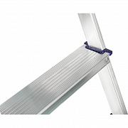 Стремянка изготовлена из высокопрочного алюминиевого профиля. Задняя и передняя нога соединены между собой. Рабочая площадка выполнена из оцинкованной стали. Ступени имеют рифлёную поверхность.