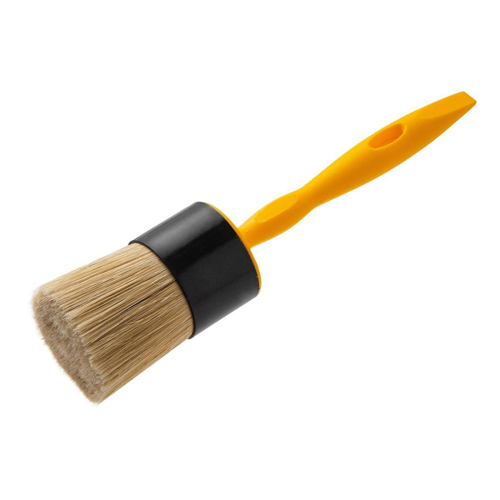 Кисть Эксперт круглая из светлой смешанной щетины оснащена длинной желтой пластиковой ручкой.