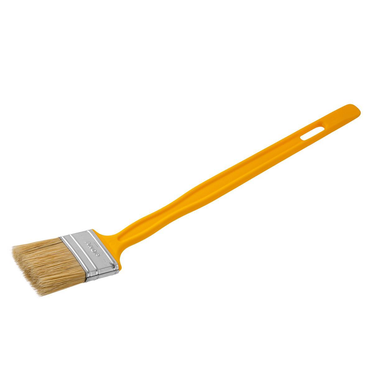 Флейцевая радиаторная кисть Эксперт, из светлой натуральной щетины, оснащена удлиненной изогнутой пластиковой ручкой.