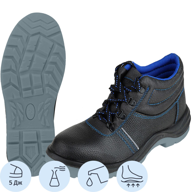 Верх ботинок изготовлен из искусственной кожи, подкладка выполнена из текстильного материала. В верхней части ботинок имеется мягкий кант из текстильного материала. Контрастная отстрочка синего цвета соответствует тону подкладки и цвету нити на шнурках, используются металлические люверсы. Ботинки имеют глухой клапан, на котором расположена мягкая вставка из поролона. Также присутствует пристроченная прилитая задинка. В носочной части расположен термопластичный подносок с ударной прочностью до 5 Дж. На боковинах находятся световозвращающие элементы в виде полосок.
