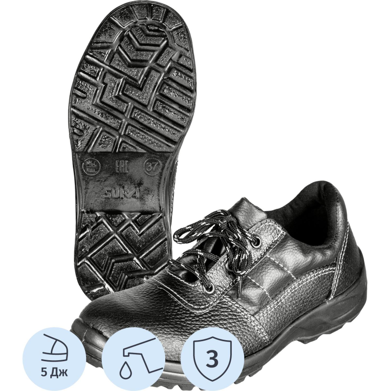 Верх обуви выполнен из натуральной кожи толщиной 2,0-2,2 мм. Мягкий кант и широкая колодка обеспечивают комфорт при носке. Термопластичный подносок для дополнительной защиты. Подошва из однослойного полиуретана с литьевым методом крепления, маслобензиностойкая.