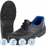 Модель оснащена термопластичным подноском с ударной прочностью 5 Дж. Подошва выполнена из однослойного полиуретана методом литьевого крепления. Вкладная анатомическая стелька обеспечивает дополнительный комфорт. Глубина профиля ходового слоя подошвы составляет 3,5 мм.
