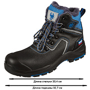 Подошва двухслойная полиуретан и нитрильная резина. Промежуточный слой из полиуретана обладает амортизирующими свойствами, гасит ударные нагрузки, а также придает обуви легкость, комфортность и повышенные теплозащитные свойства. Глухой клапан исключает попадание внутрь влаги, пыли и мелкий предметов. Объёмная колодка специальной конструкции дает возможность работать целый день, не испытывая дискомфорта и усталости. Метод крепления подошвы: литьевой.
