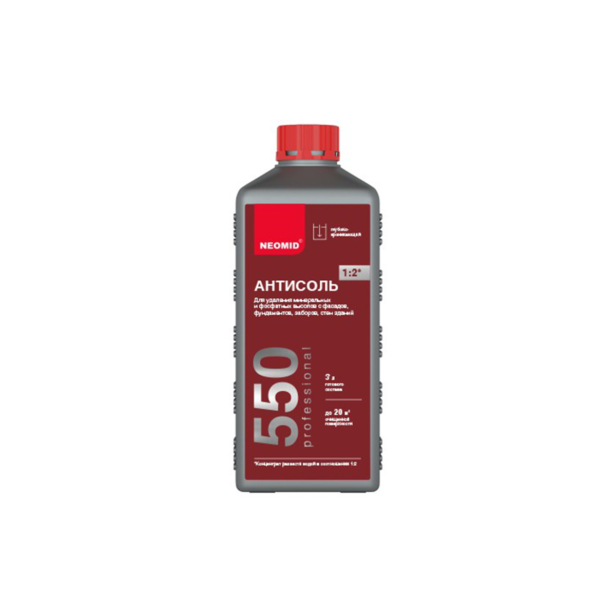 Перед применением средства, сильно пораженные участки поверхности зачистить щеткой или шпателем. Для приготовления рабочего раствора развести концентрат водой в соотношении 1:2. Кистью, валиком с синтетическим ворсом, любым разбрызгивающим устройством равномерно нанести раствор на обрабатываемую поверхность. Через 5 - 10 минут остатки средства смыть водой. При необходимости процедуру повторить. Если необходимо проводить работы по удалению высолов при отрицательных температурах, концентрат NEOMID 550 следует развести полярным растворителем (например, спирты). Во избежание повторного появления высолов, поверхность рекомендуется защитить гидрофобизирующим составом, предотвращающим проникновение влаги в строительные материалы, при сохранении паропроницаемости обработанной поверхности.