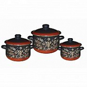 Набор посуды выполнен из высококачественного стального проката, покрытого жаропрочной эмалью. Такое покрытие защищает сталь от коррозии и придает посуде гладкую стекловидную поверхность. Кастрюли снабжены удобными ручками и металлической крышкой. Внешние стенки дополнены красочным цветочным рисунком.