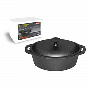 Толстостенная чугунная овальная кастрюля объемом 3,9 л с масляным термопокрытием. Используется для приготовления различных блюд.