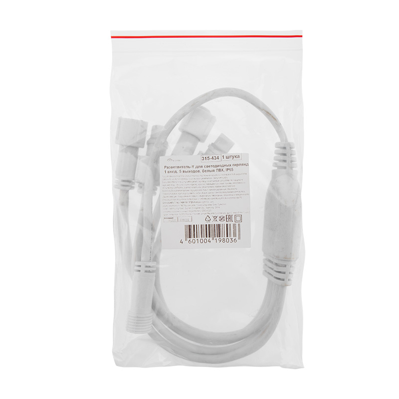 Разветвитель-Y (шнур) для уличных гирлянд, 1 вход, 5 выходов, белый ПВХ NEON-NIGHT
