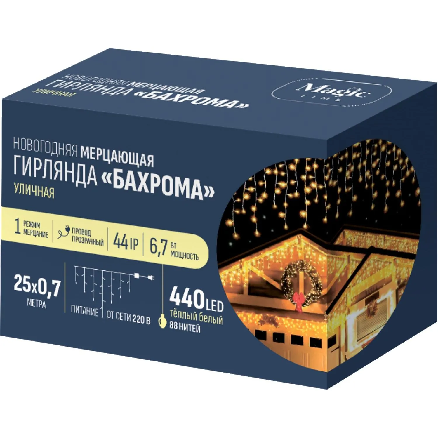 Электрогирлянда Magic Time Бахрома тёплый белый свет 440 светодиодов (25 м)LED-гирлянда «Бахрома» может быть использована как на улице, так и в помещении. Имеет степень влагозащиты IP44. Состоит из 440 LED-лампочек тёплого белого света. Имеет 1 режим свечения (мерцание). Длина гирлянды 2500 см, длина нитей от 25 до 70 см. Питание от сети 220 В, мощность 6,7 Вт, сила тока 0,09 А.
