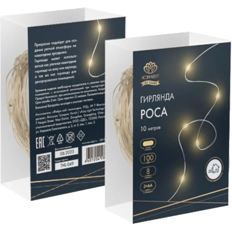 Гирлянда светодиодная Neon-Night Роса нить тёплый белый свет 100 светодиодов (10 м)Гирлянда Роса — это декоративный элемент, который представляет собой нить с маленькими светодиодами, напоминающими капельки росы.