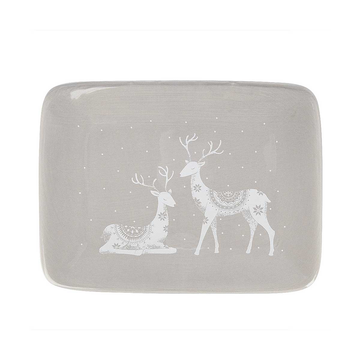 Блюдо сервировочное керамическое прямоугольное. Покрыто серой глазурью с изображением оленя.