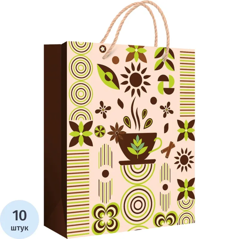 Подарочный пакет имеет размеры 22.7×18×10 см и выполнен из матовой бумаги. Этот пакет среднего размера с принтом чашечки чая или кофе придаст вашему подарку свежесть и особый шарм. Матовая ламинация делает упаковку ярким украшением для любого праздника или торжественного события.