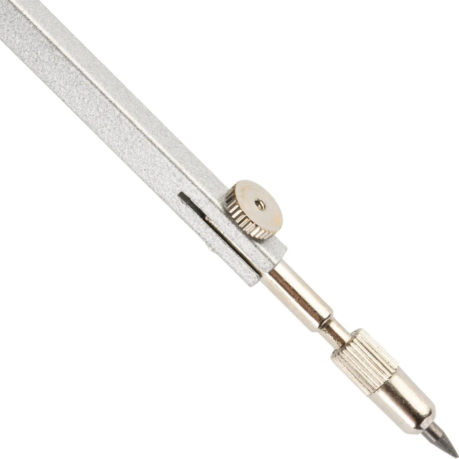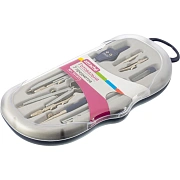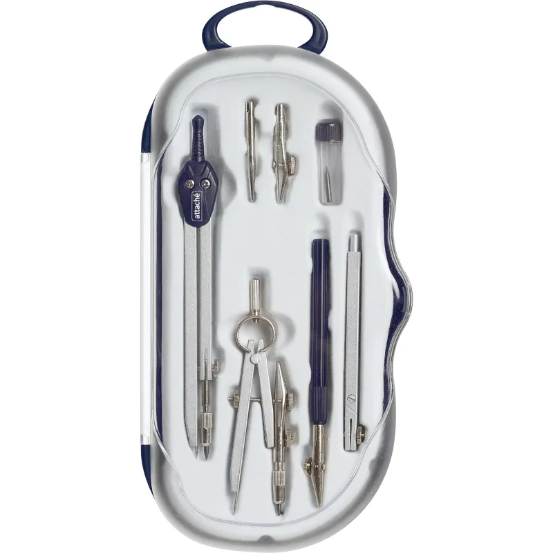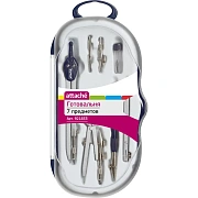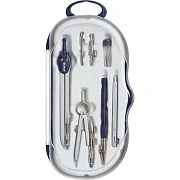 Набор чертежных принадлежностей включает циркуль из металлического сплава (длина 135 мм), запасной грифель, рейсфедер, точечную насадку, рейсфедерную вставку, удлинитель и кронциркуль. Циркуль предназначен для школьников средних и старших классов, специалистов, архитекторов и конструкторов. Упакован в ударопрочный пластиковый пенал с европодвесом, что исключает повреждение и сохраняет принадлежности исправными. Циркуль поставляется в нескольких вариантах дизайна (без выбора). Производство — Китай. В промежуточной упаковке 12 наборов, в транспортной — 72.