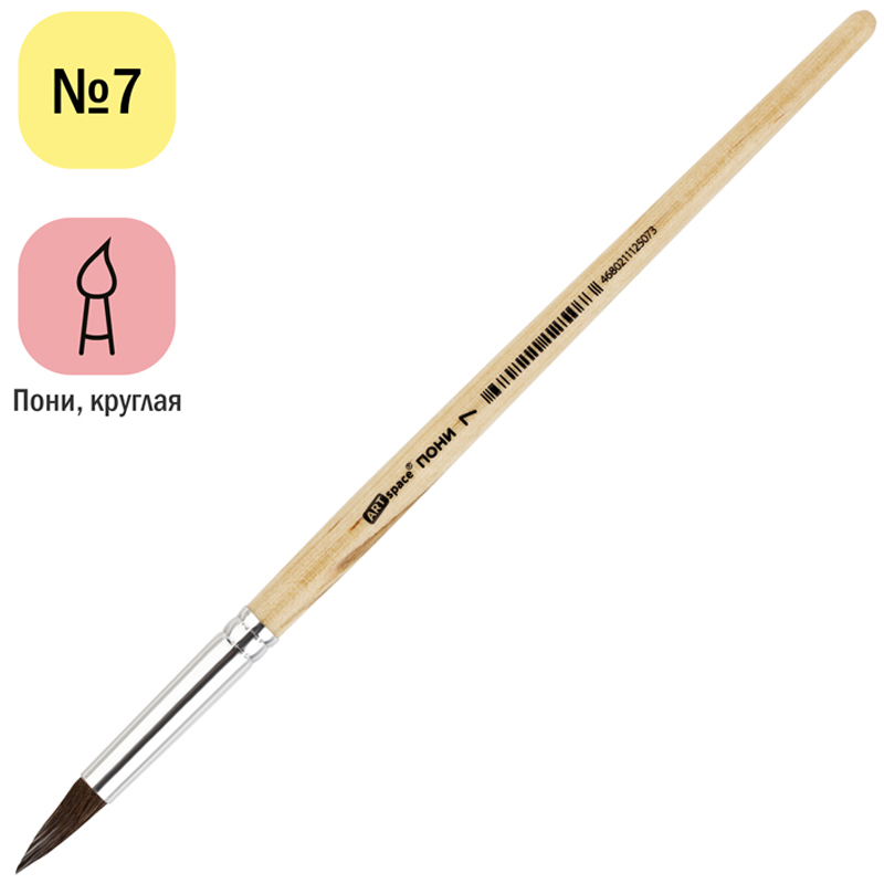 Художественные кисти ArtSpace изготовлены из волоса пони. Он несколько толще, чем у белки, расстояние между волосками больше, поэтому воду такая кисточка набирает меньше, чем из белки или колонка. Приобретают форму конуса, не слишком упруги. Кисть круглой формы с короткой ручкой из дерева идеальна для начинающих художников, поэтому её часто используют в детских образовательных учреждениях.
