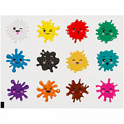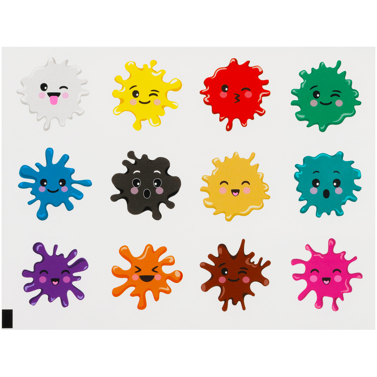 Наклейки с забавной кляксой с цветом краски в каждой коробке! Мы предлагаем юному художнику развивающую игру - найти нужный цвет и наклеить соответствующую наклейку на крышечку.