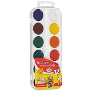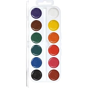 Набор включает 12 полусухих красок: белила, жёлтая, тёмно-жёлтая, оранжевая, алая, розовая, светло-зелёная, изумрудно-зелёная, голубая, фиолетовая, коричневая, чёрная.