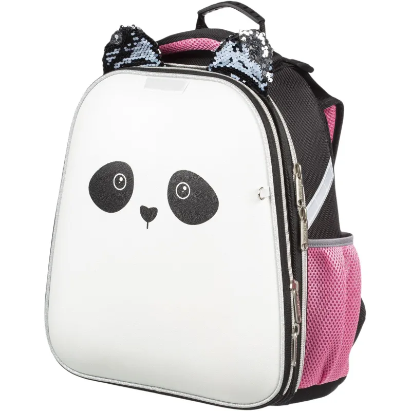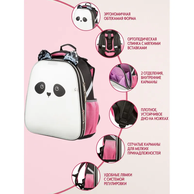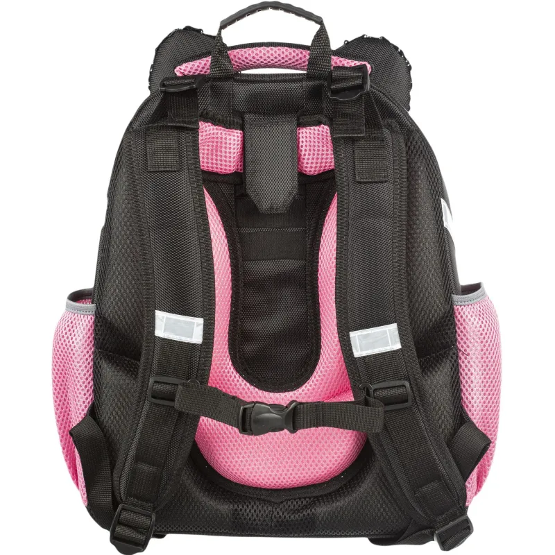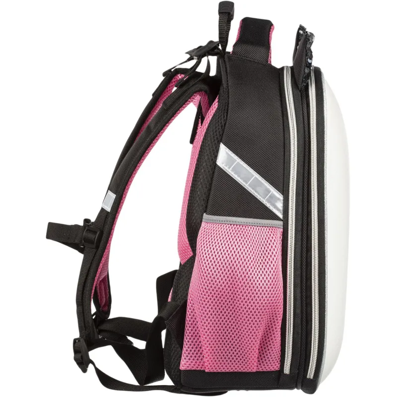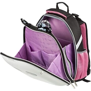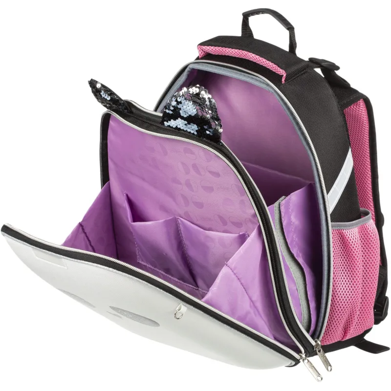 Ранец эргономичной обтекаемой формы. Прочная конструкция ранца надежно защищает его содержимое за счет плотного формованного материала. Жесткая анатомическая спинка с мягкими вставками с поддержкой в области поясницы. Широкие удобные лямки из воздухообменного сетчатого материала имеют систему регулировки по росту ребенка, что позволяет добиться наиболее комфортного расположения ранца на спине. Плотное, устойчивое дно на ножках. Ранец имеет два отделения на молнии. В первом отделении — гибкая перегородка, предназначенная для удобного хранения книг и тетрадей. Во втором — сетчатый карман. Также на ранце по бокам расположены сетчатые карманы для мелких принадлежностей. Светоотражающие элементы для дополнительной безопасности на лицевой стороне, боковых частях ранца, а также на лямках. Основной материал — полиэстер. Особенности: передняя крышка ранца выполнена из перламутровой экокожи, ушки из двусторонних пайеток.Цвет подкладки рюкзака может отличаться от варианта, представленного на фото. Ранец упакован в плотный брендированный пакет с ручками и с замком Zip Lock, что позволяет удобно переносить ранец, хранить без повреждений.