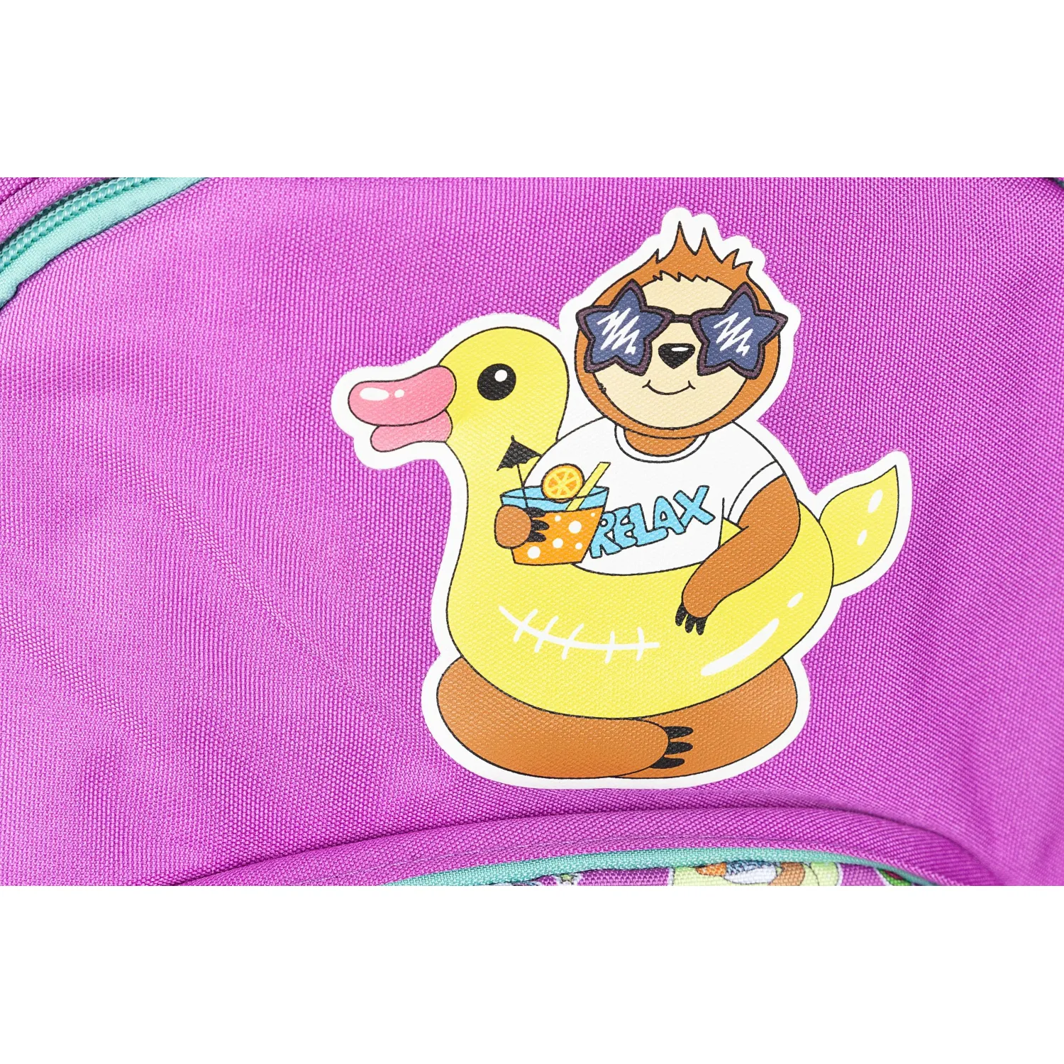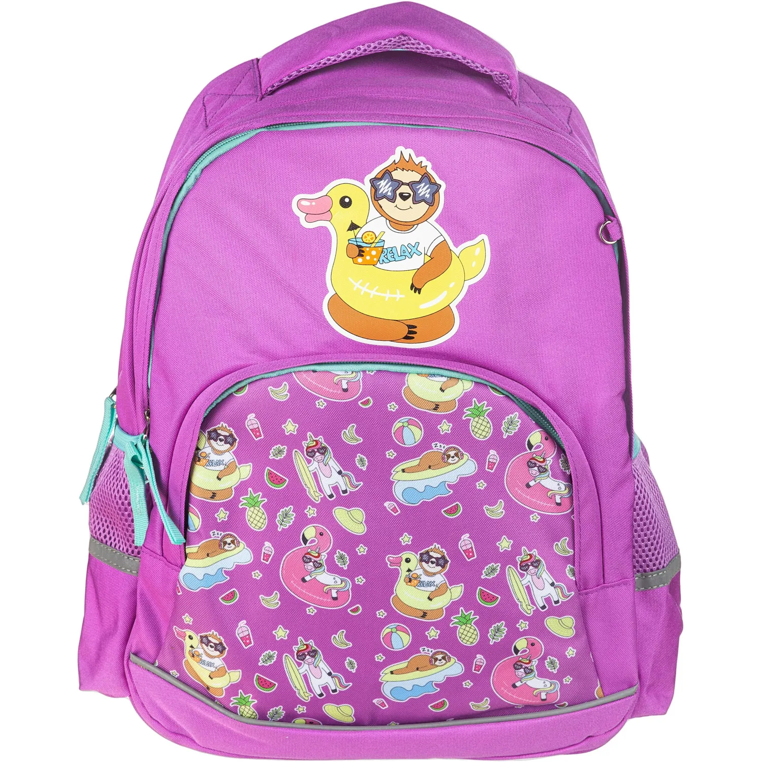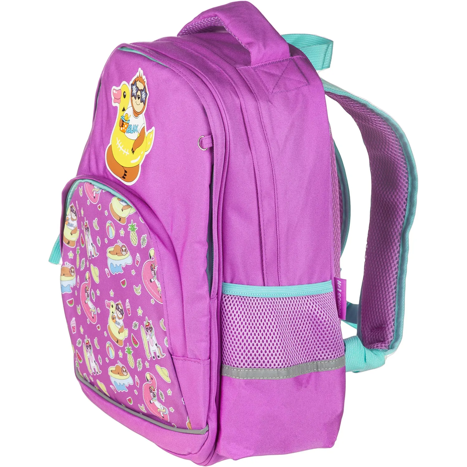 Рюкзак для девочек № 1 School «Довольный ленивец» имеет два основных отделения и большой фронтальный карман на молнии с нанесенным орнаментом, а также два боковых сетчатых кармана. Одно отделение содержит органайзер с молнией, дополнено карманом на молнии для карточки. Основной материал полиэстер. Рюкзак снабжен светоотражающими элементами и ортопедической спинкой. Размеры (ДхШхВ) — 330×140×400 мм. Вес — 750 г.