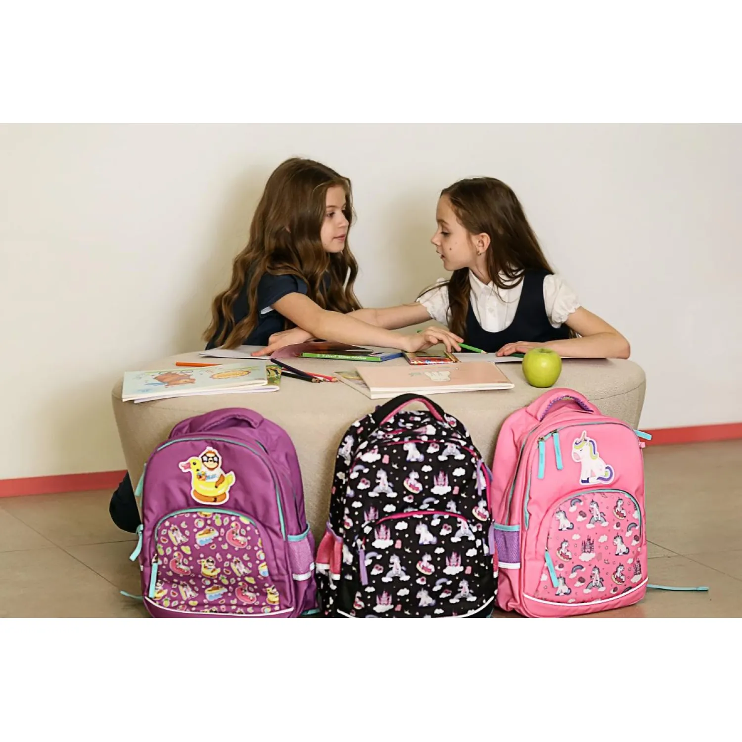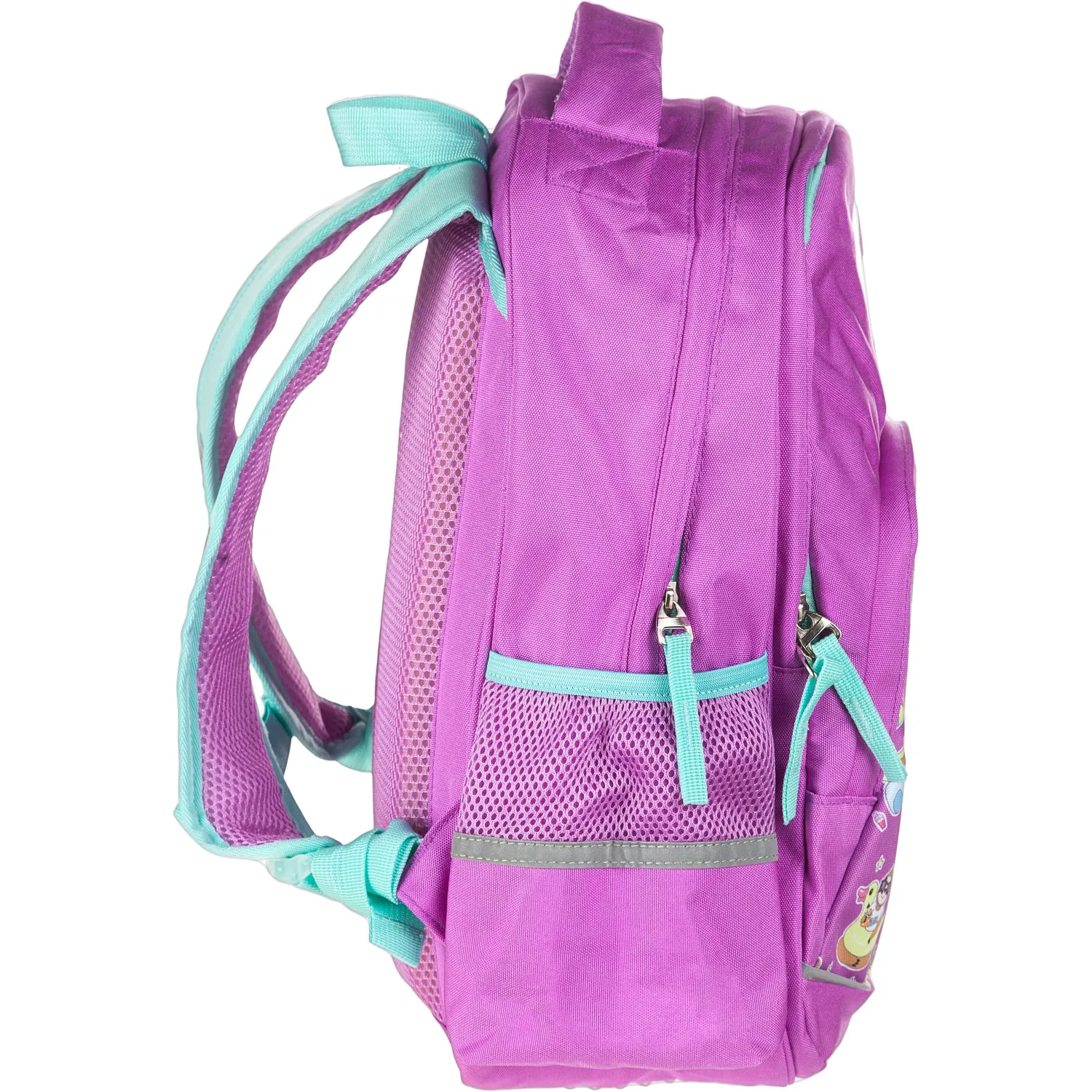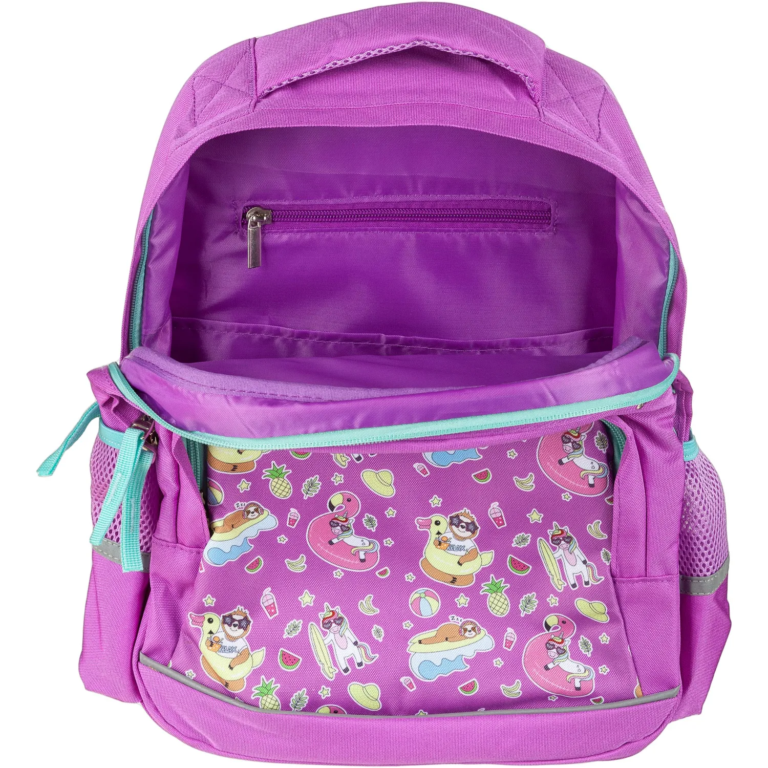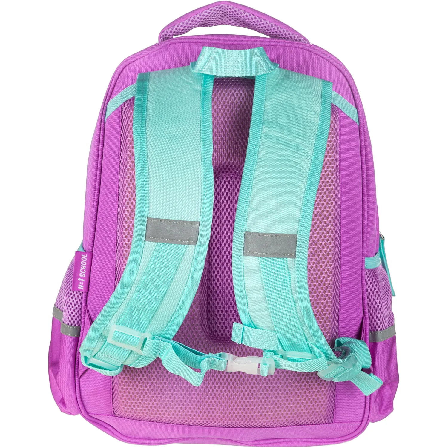 Рюкзак для девочек № 1 School «Довольный ленивец» имеет два основных отделения и большой фронтальный карман на молнии с нанесенным орнаментом, а также два боковых сетчатых кармана. Одно отделение содержит органайзер с молнией, дополнено карманом на молнии для карточки. Основной материал полиэстер. Рюкзак снабжен светоотражающими элементами и ортопедической спинкой. Размеры (ДхШхВ) — 330×140×400 мм. Вес — 750 г.